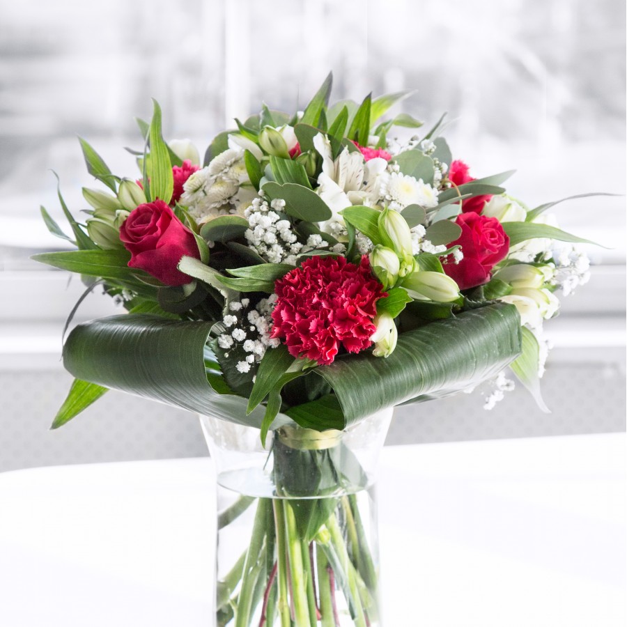 This bouquet will provoke your sense of creativity and imagination. Featuring sweet white chrysanthemums and gypsophila, luxurious red roses and carnations, delicately arranged with white alstroemeria and aspidistra leaves.